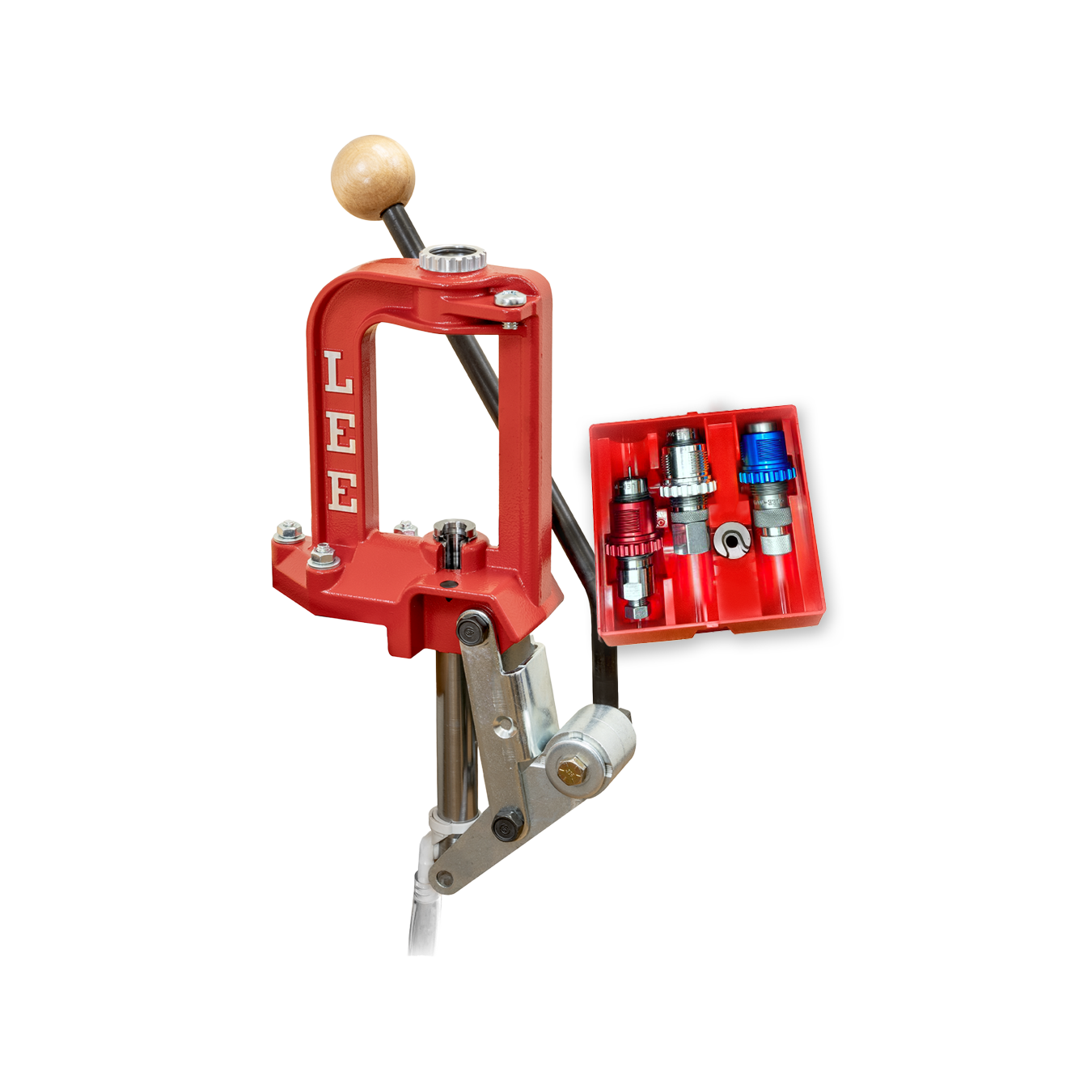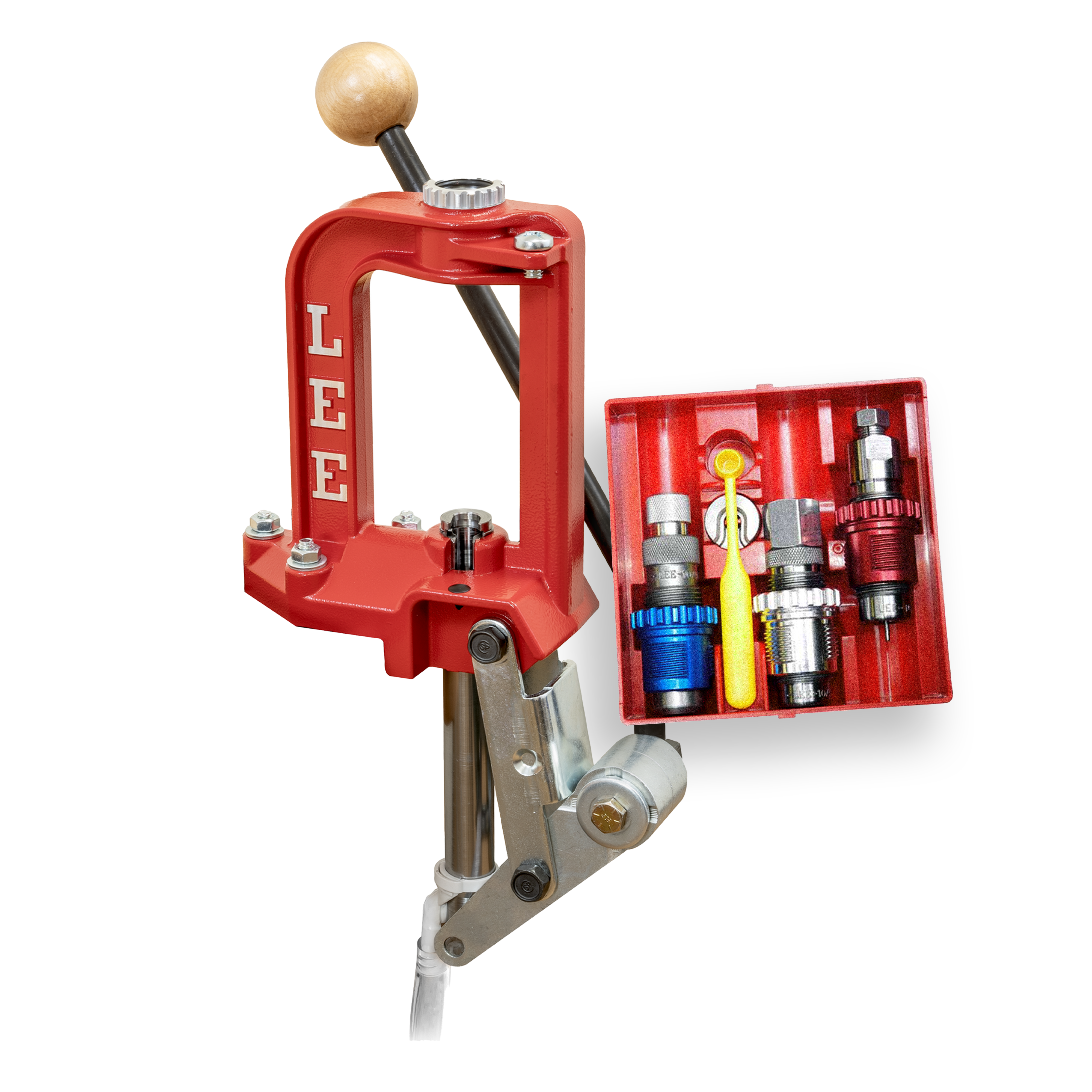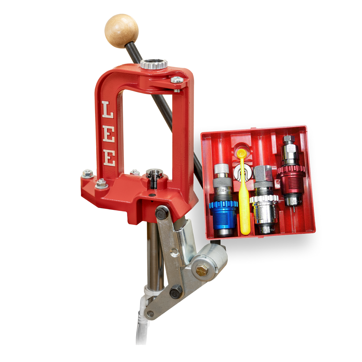 O sistema Lee Lever Prime (espoletamento) presente nessa prensa oferece uma sensibilidade incrível ao toque, garantindo uma operação precisa. Ele inclui um espoletador para espoletas large e small. Além disso, o coletor de espoletas utilizando o sistema de mangueira, permite descartar as espoletas usadas diretamente na lixeira.